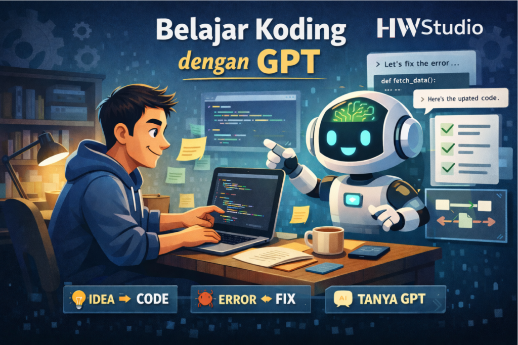 Di artikel ini saya tulis cara saya belajar koding pakai GPT dengan gaya praktik: langkahnya apa, prompt-nya bagaimana, cara ngecek error, sampai cara “mengunci” hasil supaya tidak rusak saat revisi.